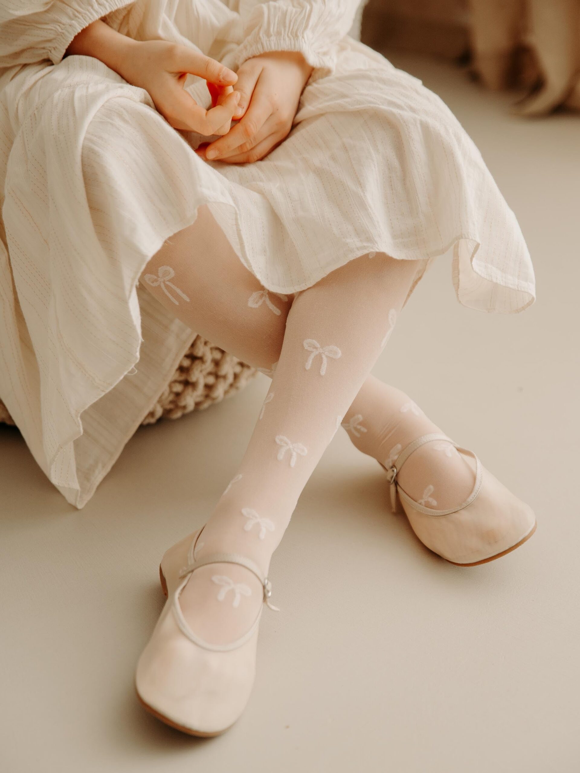 - Otroške hlačne nogavice in sladka simfonija mašnic! Raziščite dekliški svet elegance in šarma z belimi hlačnimi nogavicami v nežnem vzorcu pentlje v beli barvi.
